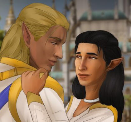 This is the verse where Daren and Heulwen fell in love romantically, not platonically! They're deliriously, disgustingly happy right up until the Landsmeet when they end it so that he can marry Anora. It's devastating but they both genuinely believe it's the best option for Ferelden. They try - once - to start an extramarital affair but it goes horribly. With time, the pain fades and Daren grows to love his wife more every day. Heulwen reconnects with Zevran while searching for the cure to the Calling, sparking a passionate romance. They are both happy, but they never fell out of love either. Years later, when she visits Denerim, they'll sit quietly in the garden ... holding hands.Maeve Verse: